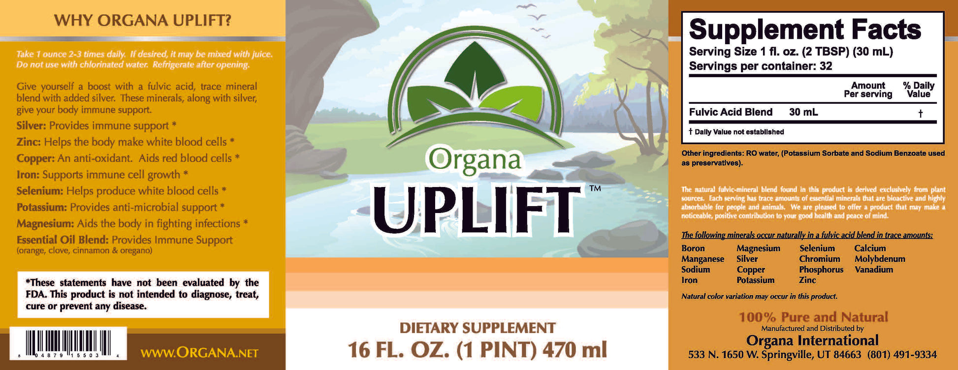 Organa Mineral Drink, which contains up to 74 trace minerals, is rich in fulvic acid.Ā Uplift's mineral content, with fulvic acid strengthens the body for healthy living.Ā These minerals are extracted exclusively from an ancient plant source using a natural process that does not harm the minerals.Ā Ā